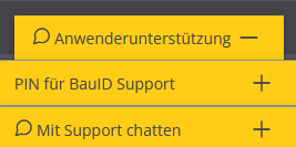 Es öffnen sich die Optionen für die Anwenderunterstützung. Klicken Sie hier auf den gelben Button PIN für BauID-Support: