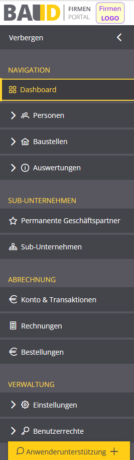 Haben Sie ein Problem oder eine Frage, können Sie einer BauID Supportmitarbeiter:in Zugriff auf Ihren Benutzer geben. Die Supportmitarbeiter:in kann sich dann über Ihren Benutzer im Firmen-Portal anmelden, um die Problematik zu prüfen.