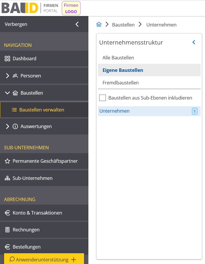 In der Lasche Unternehmensstruktur können Sie wählen, ob Sie alle, Ihre eigenen oder nur Fremdbaustellen sehen möchten.