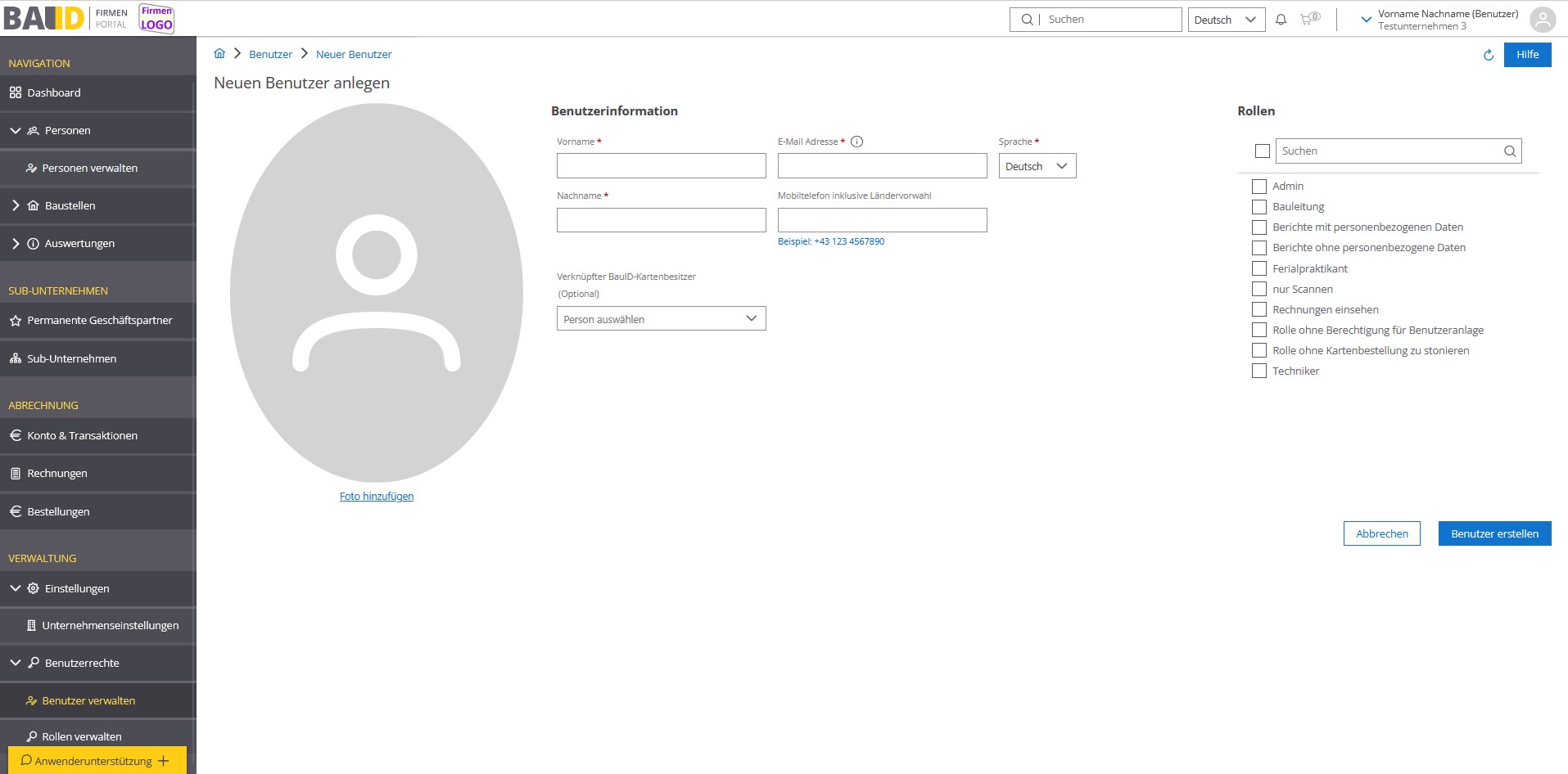 Zur Verwaltung Ihres Unternehmens und Ihrer Mitarbeiter:innen im BauID-System können Sie für Ihre Mitarbeiter:innen Benutzer anlegen und diesen Benutzern Rollen mit bestimmten Berechtigungen vergeben. Für größere Firmen empfiehlt es sich vorab schon Rollen für die verschiedenen Tätigkeiten anzulegen. Mehr Information zu den Rollen finden Sie hier.