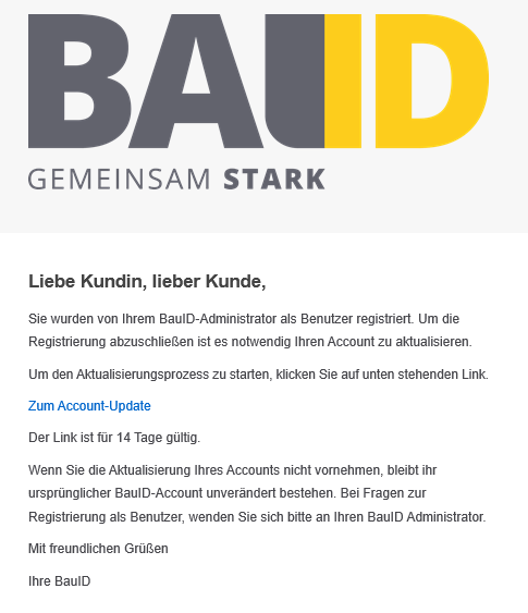 Um das Konto zu aktualisieren, wird an die E-Mailadresse, die Sie bei der Anlage des Benutzers hinterlegt haben, ein E-Mail mit dem Betreff „Aktualisieren Sie Ihr Konto“ gesendet. Um den Zugang zum BauID-System zu erhalten, muss sich der Benutzer verifizieren.