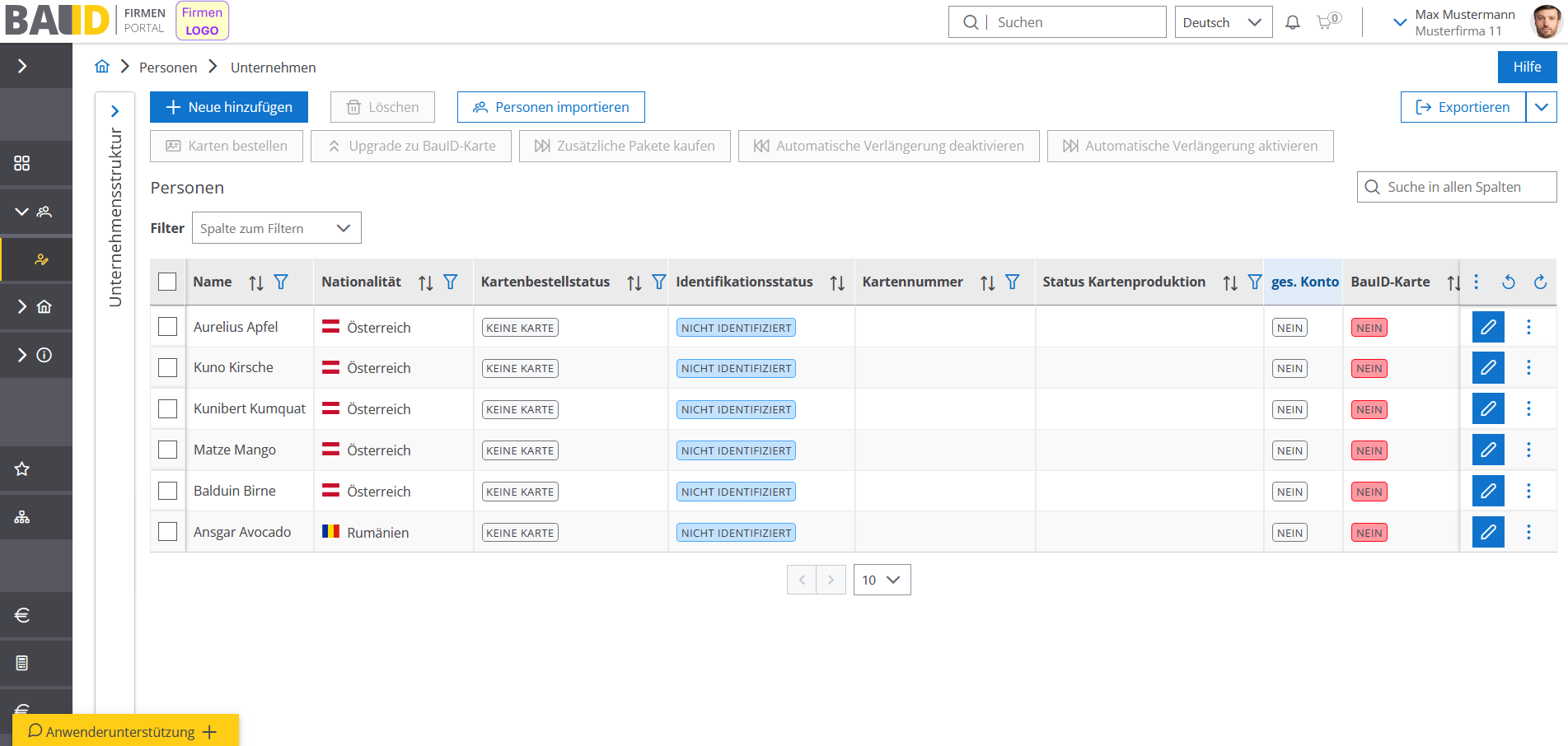 Unter Personen verwalten können Sie neue Personen anlegen oder per CSV gesammelt importieren. Zudem können Sie hier BauID-Karten bestellen oder ein Upgrade einer BUAK Service-Karte durchführen. Weiters können Sie Nutzungspakete zu den Personen bestellen und einsehen.