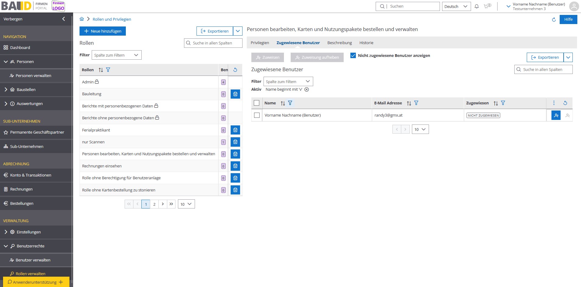Rufen Sie im Menü Benutzerrechte > Rollen verwalten auf, um die Rollen für Ihr Unternehmen zu administrieren: