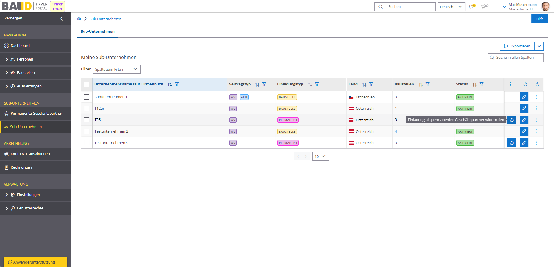 Hier können Sie anhand der Spalte Einladungstyp unterscheiden, ob es sich um einen permanenten Partner (permanent) handelt, oder um eine gelegentliche Zusammenarbeit (Baustelle):
