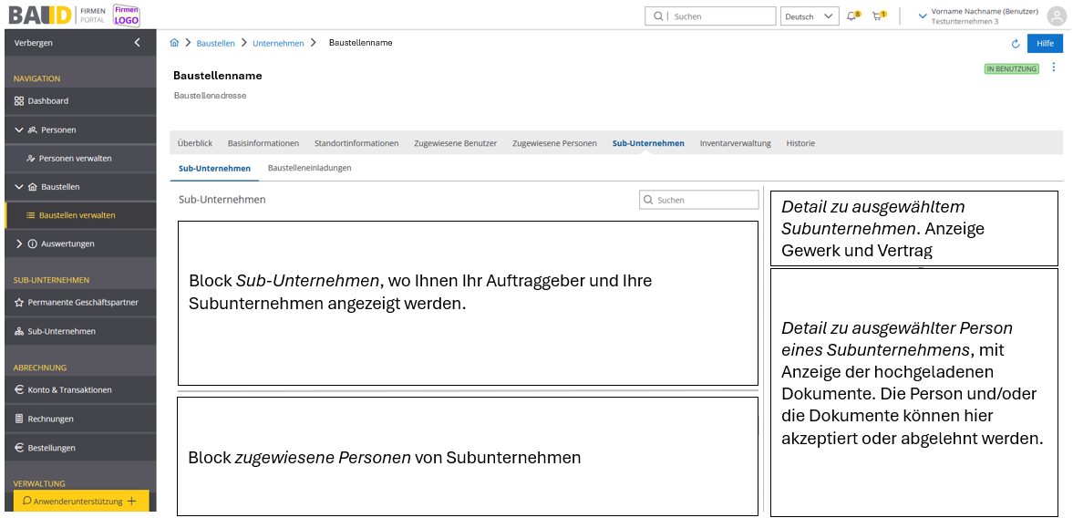 Als Baustellenbesitzendes Unternehmen sind alle Sub-Unternehmen die auf der Baustelle tätig sind für Nutzer:innen des Unternehmens einsehbar.